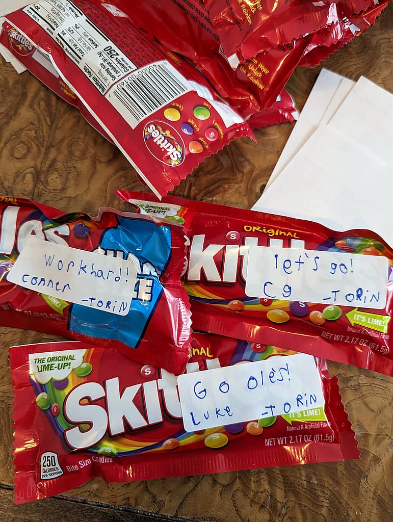 Through countless games and practices, Torin supports his team. Each home game, Torin buys two bags of Skittles—one for him and one to share with his teammates on the bench. For an away game on Valentines Day, Torin wrote notes to each player on a bag of Skittles so they could continue their game day traditions, even while apart. With Torin on their roster, the Oles have won dozens of games and made huge runs in postseason play. Just last month, Torin was honored on court with his Oles at Senior Day.